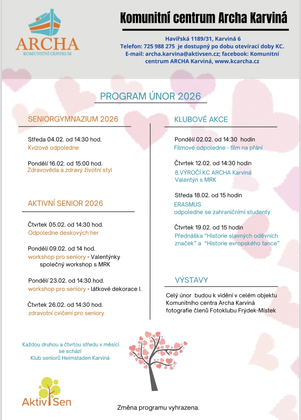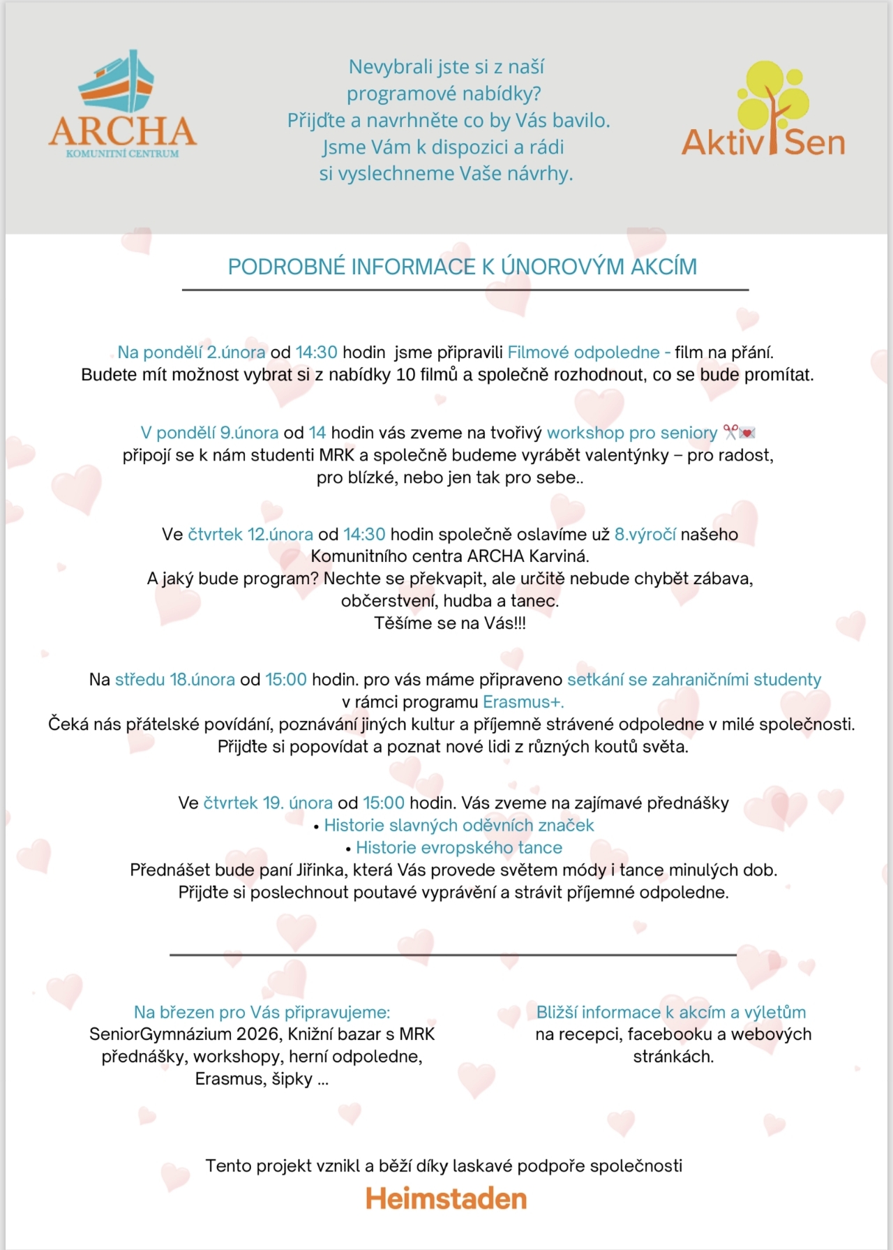 Komunitní centrum Archa slouží seniorům z Poruby, kteří nechtějí být jen doma, chtějí se učit novým věcem a setkávat se s přáteli. Podmínkou pro vstup do centra a využívání jeho prostor je členství v tzv. "Klubu přátel Archa". Tímto opatřením docílíme, že do centra budou docházet lidé, o nichž budeme mít přehled a zamezíme riziku krádeží. Členem se stáváte tehdy, když vypíšete jednoduchou přihlášku, která je ke stažení na našem webu v sekci přihláška, nebo ji obdržíte na recepci. Členové platí roční poplatek 100 Kč, ze kterého se následně platí např. sanitární prostředky.